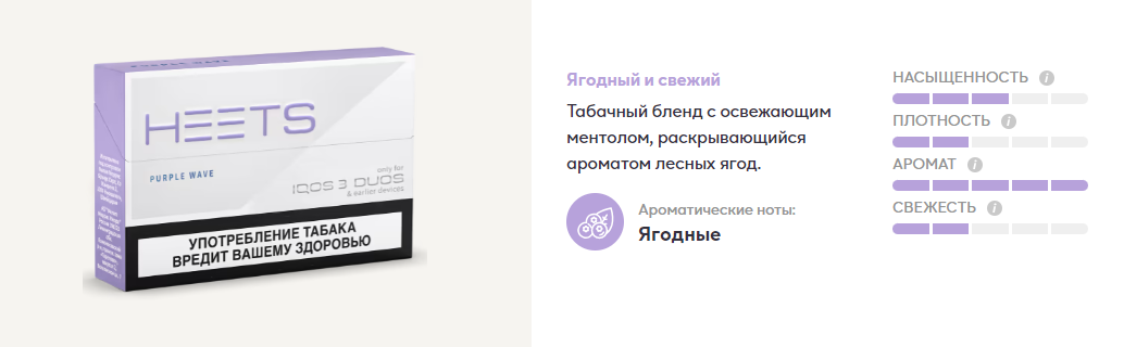 HEETS PURPLE WAVE – табачный бленд с освежающим ментолом, раскрывающийся ароматом лесных ягод.